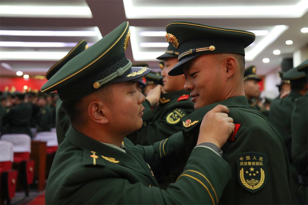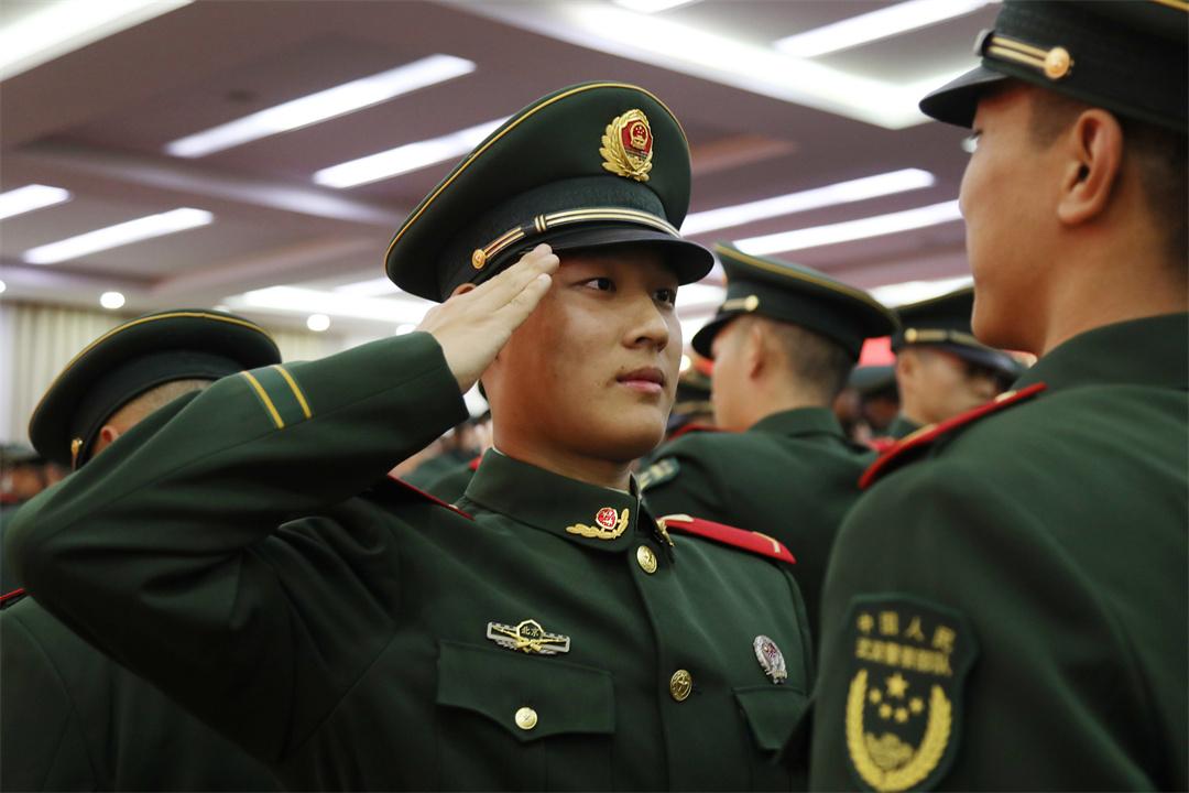 授銜儀式上,全體新戰(zhàn)友相互佩戴嶄新的紅肩章和閃耀的警徽,互敬軍禮,眼神中閃爍著驕傲與自豪的光芒。從這一刻起,他們正式成為武警部隊的一員,肩負(fù)起保家衛(wèi)國神圣使命。“苦練殺敵本領(lǐng),時刻準(zhǔn)備戰(zhàn)斗,決不叛離軍隊,誓死保衛(wèi)祖國?!比w新兵高舉右拳莊嚴(yán)宣誓,誓詞鏗鏘,字字千鈞,詮釋著軍人的使命和擔(dān)當(dāng)。