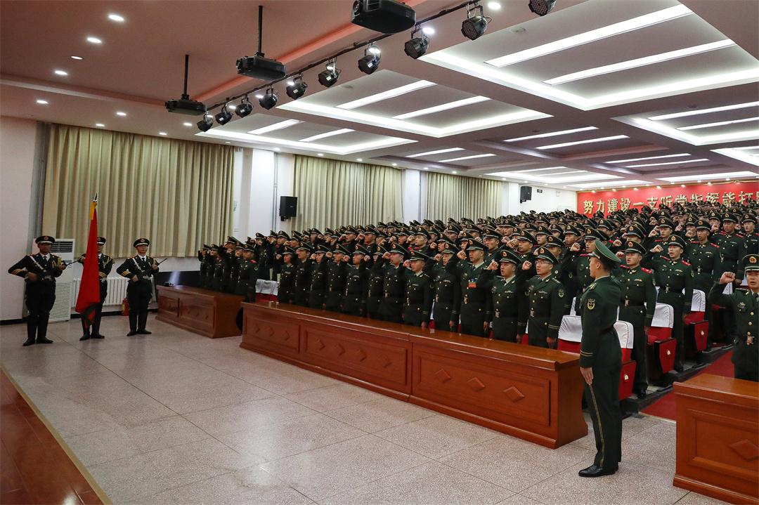 圖為授銜后,全體官兵面向武警部隊旗莊嚴(yán)宣誓。