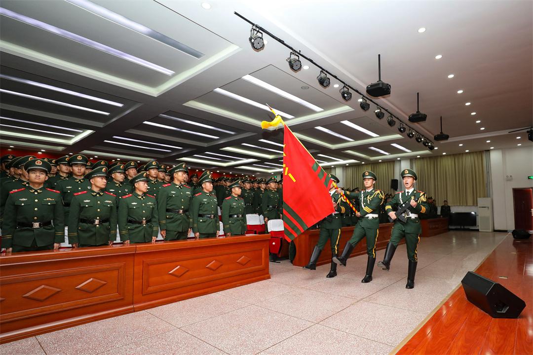 儀式在雄壯的中國人民解放軍軍歌聲中拉開帷幕?!坝渚筷犉欤 彪S著口令下達(dá),三名擎旗手高舉武警部隊旗正步走過臺前,全體新兵軍姿挺拔、精神昂揚(yáng),向武警部隊旗行注目禮。
