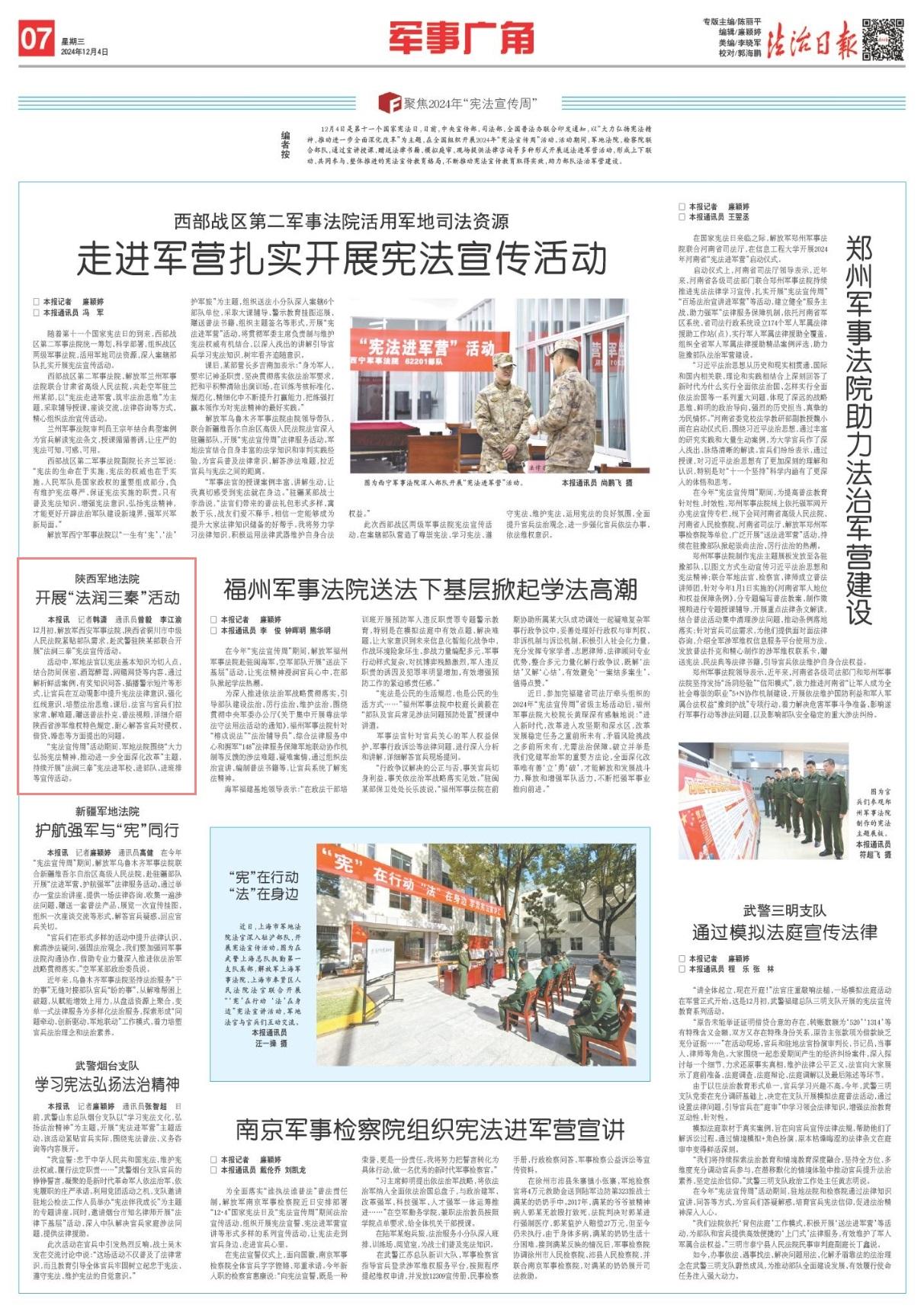 “憲法宣傳周”活動(dòng)期間,軍地法院圍繞“大力弘揚(yáng)憲法精神,推動(dòng)進(jìn)一步全面深化改革”主題,持續(xù)開展“法潤(rùn)三秦”憲法進(jìn)軍校、進(jìn)部隊(duì)、進(jìn)班排等宣傳活動(dòng)。