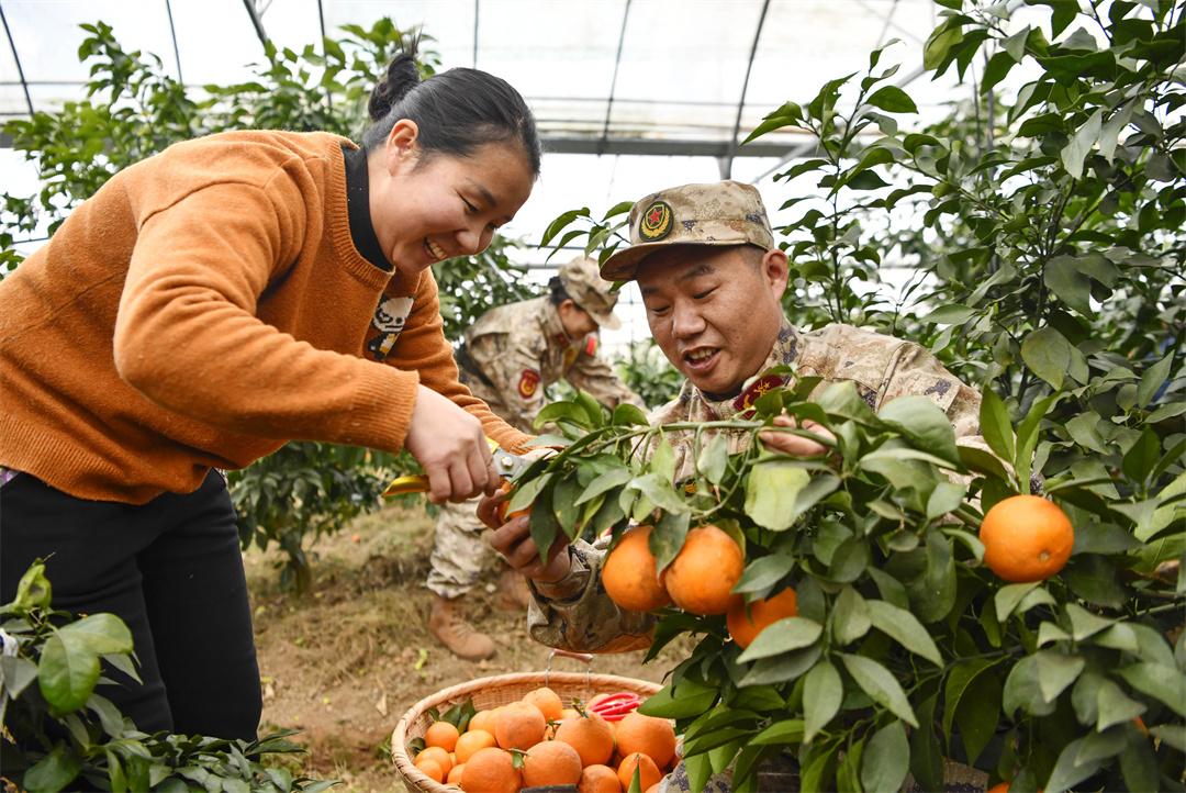 1月9日,安徽省合肥市廬江縣人武部組織“民兵助農(nóng)志愿者小分隊(duì)”,來(lái)到廬江縣羅河鎮(zhèn)鮑店村幫助果農(nóng)采收冬橙,搶抓時(shí)節(jié)供應(yīng)市場(chǎng)。圖為民兵在鮑店村幫果農(nóng)采摘冬橙。