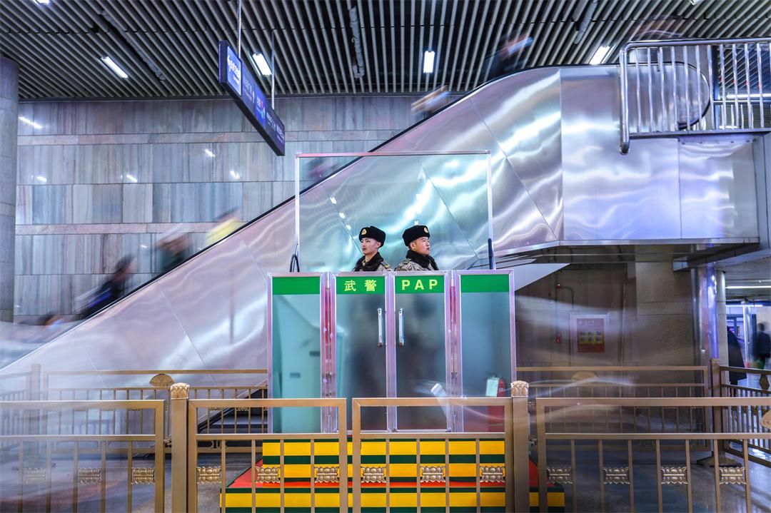 圖為北京西站地下通道內(nèi)兩名武警正在認(rèn)真履行職責(zé)。