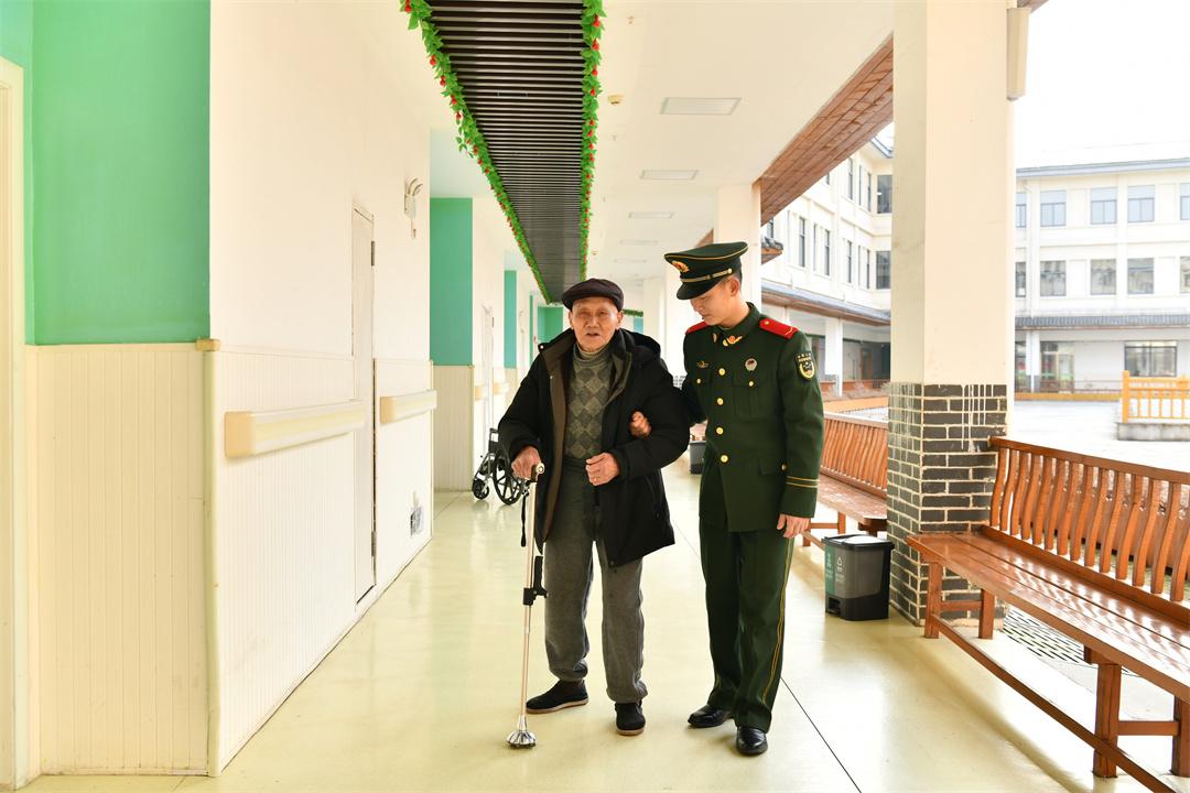 圖為官兵陪駐地福利院老人走廊散步。