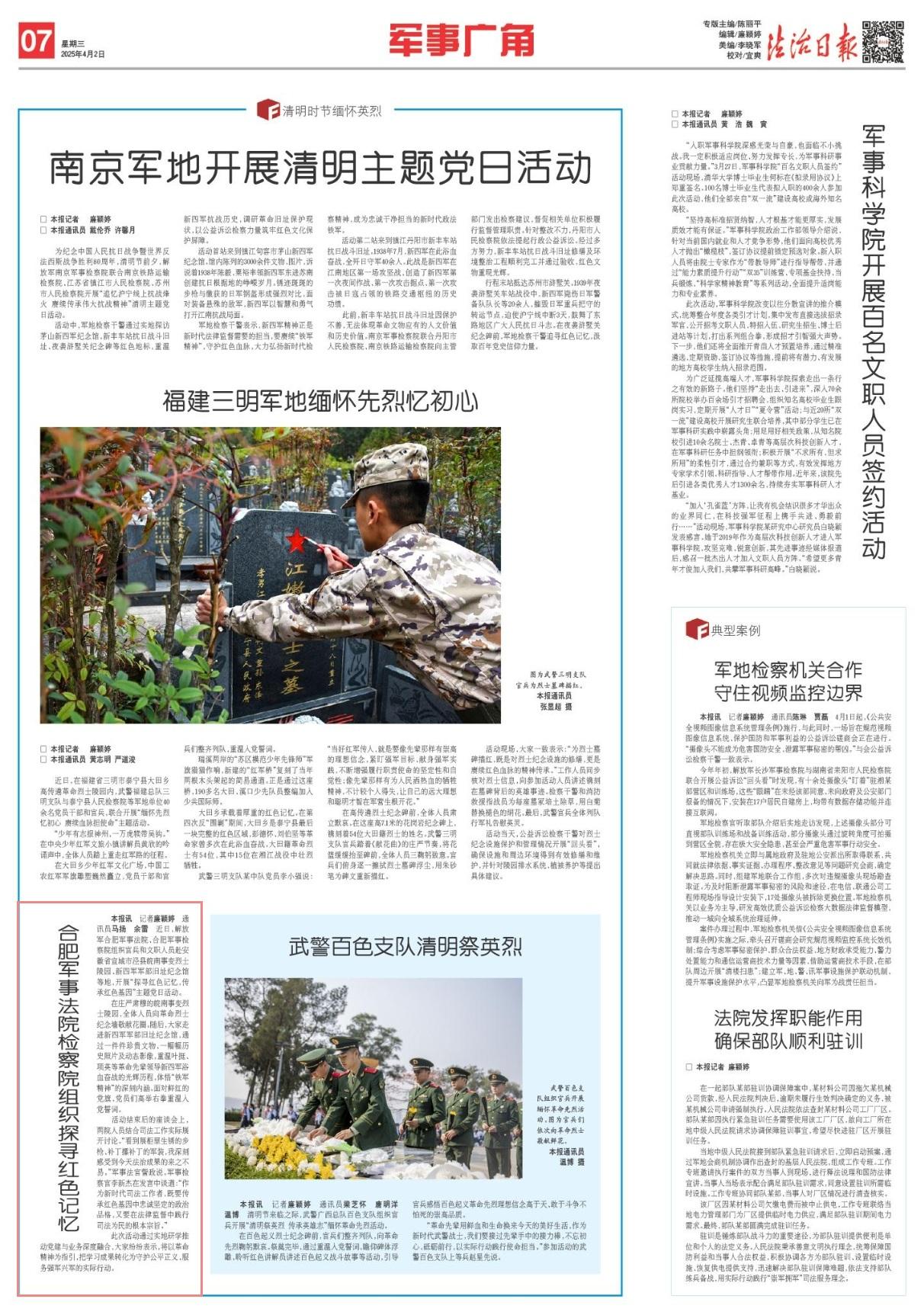 近日,解放軍合肥軍事法院、合肥軍事檢察院組織官兵和文職人員赴安徽省宣城市涇縣皖南事變烈士陵園、新四軍軍部舊址紀念館等地,開展“探尋紅色記憶,傳承紅色基因”主題黨日活動。