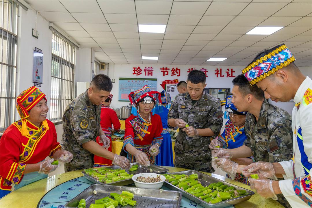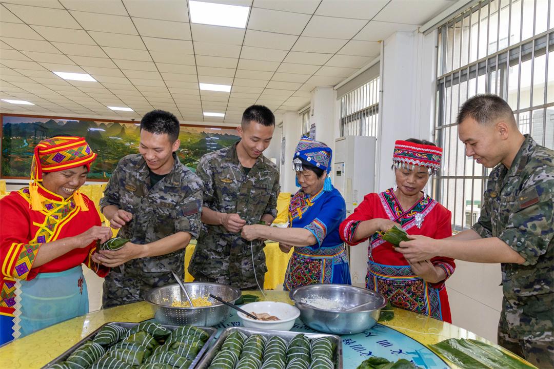圖為壯鄉(xiāng)群眾教武警官兵包壯鄉(xiāng)彩粽。
