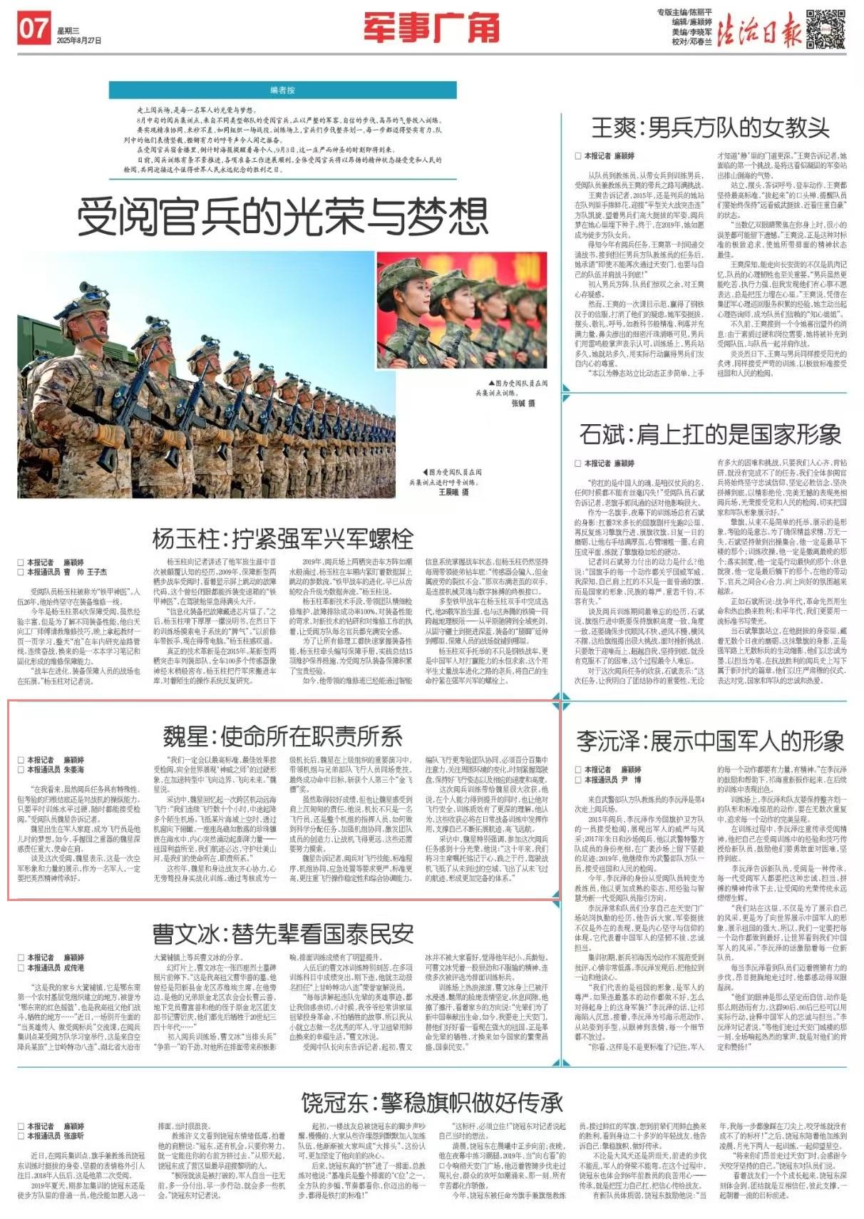 談及這次受閱,魏星表示,這是一次空軍形象和力量的展示,作為一名軍人,一定要把英烈精神傳承好。