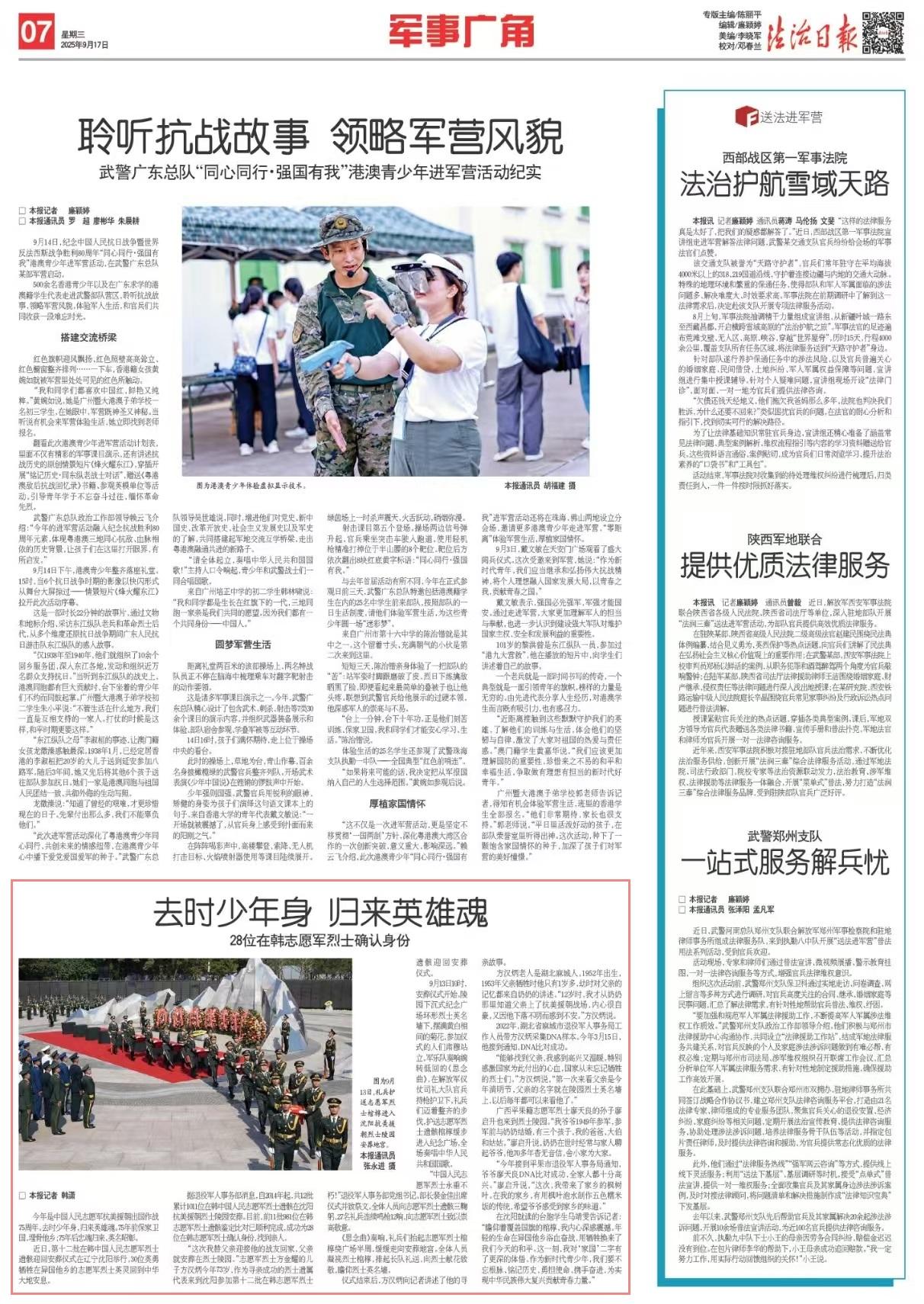 在沈陽就讀的臺胞學(xué)生馬靖雯告訴記者:“瞻仰著覆蓋國旗的棺槨,我內(nèi)心深感震撼。年輕的生命在異國他鄉(xiāng)浴血奮戰(zhàn),用犧牲換來了我們今天的和平。這一刻,我對‘家國’二字有了更深的體悟。作為新時代青少年,我們要不忘根脈、銘記歷史,勇?lián)姑?、攜手奮進(jìn),為實(shí)現(xiàn)中華民族偉大復(fù)興貢獻(xiàn)青春力量?!?/p>