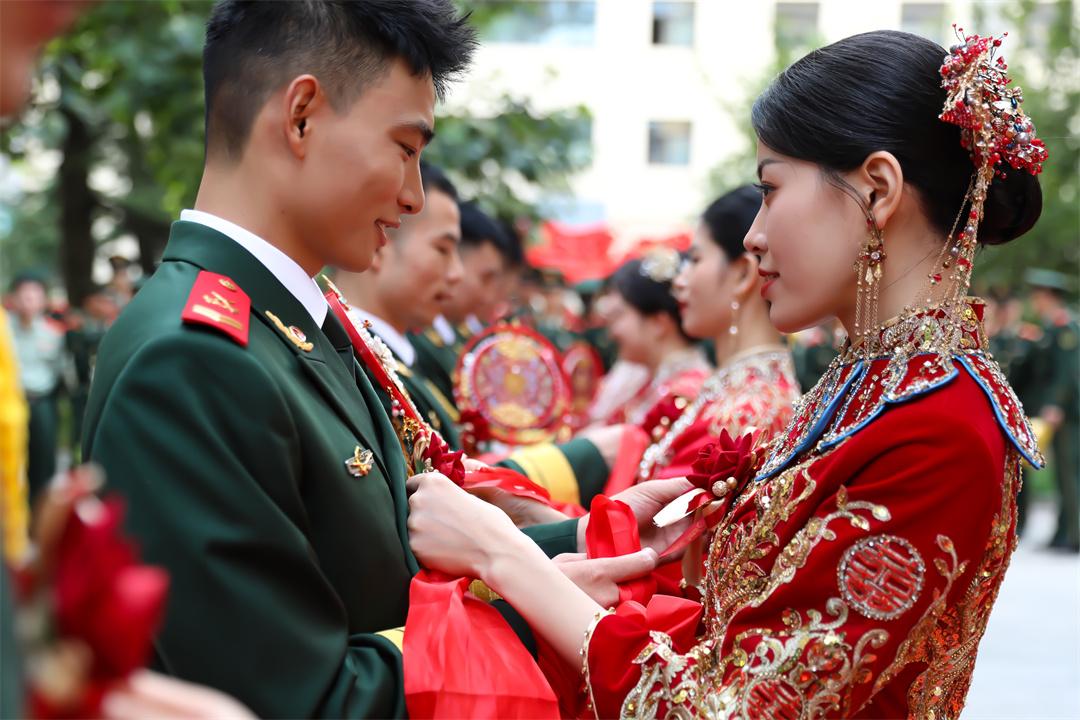 清晨,營區(qū)臨時(shí)改造的化妝間已是燈火通明,10位新娘端坐于迷彩梳妝臺輕點(diǎn)朱唇、巧挽發(fā)髻,鏡中秀禾服的朱紅與窗外國旗的鮮紅交相輝映,新娘們指尖輕撫嫁衣刺繡,眼底滿是對幸福的期盼。新郎們身著筆挺禮服英姿颯爽,神情莊重卻難掩喜色。