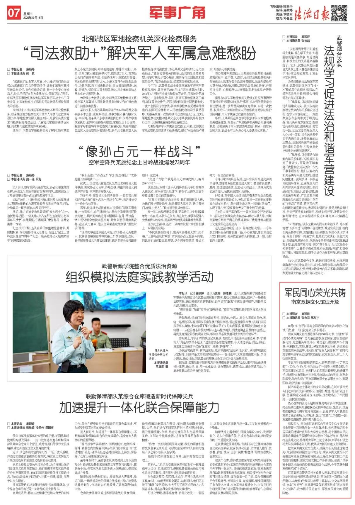 江蘇省南京警備區(qū)相關(guān)負(fù)責(zé)人表示,南京雙擁文化館是繼地鐵5號線雙擁線開通后,南京市又一雙擁文化展示窗口,與地鐵4號線國防教育主題車站、公交25路雙擁線、電車“雙擁號”、雙擁周刊及版面展等組成“南京雙擁文化矩陣”,成為提升國防意識,厚植家國情懷的重要陣地。