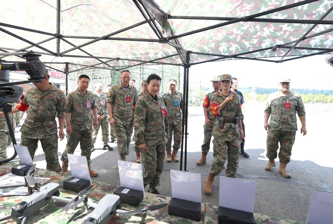 圖為觀摩特色民兵分隊(duì)無(wú)人飛行設(shè)備。