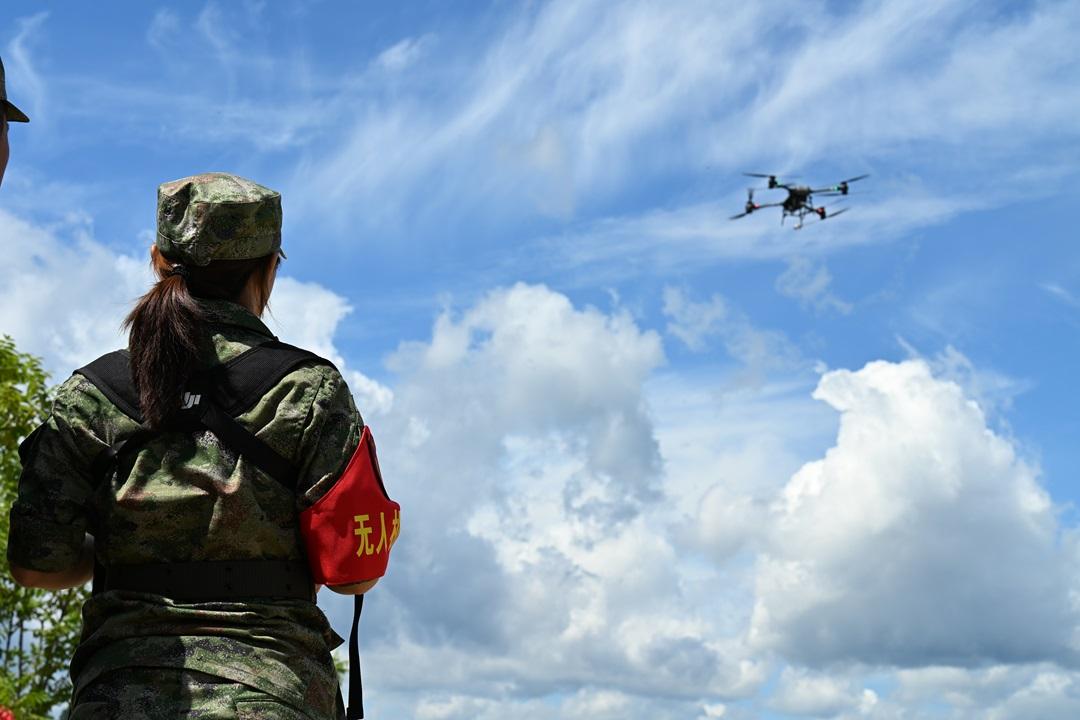 圖為“一曼”女子民兵分隊(duì)無(wú)人機(jī)操作手進(jìn)行課目演示。