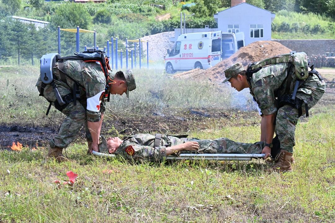 圖為“綠盾”特色民兵分隊(duì)使用外骨骼設(shè)備進(jìn)行戰(zhàn)場(chǎng)傷員救治課目演示。