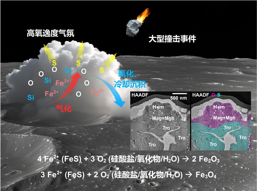自人類(lèi)登月以來(lái),月球被認(rèn)為整體還原,極度缺少氧化作用的關(guān)鍵證據(jù),特別是赤鐵礦等高價(jià)態(tài)鐵氧化物。研究提出,赤鐵礦的形成可能與月球歷史上的大型撞擊事件密切相關(guān)。大型撞擊形成瞬時(shí)高氧逸度氣相環(huán)境的同時(shí),鐵元素在高氧逸度環(huán)境中被氧化,使隕硫鐵發(fā)生了脫硫反應(yīng),經(jīng)氣相沉積過(guò)程形成微米級(jí)晶質(zhì)赤鐵礦顆粒。值得關(guān)注的是,該反應(yīng)的中間產(chǎn)物為具有磁性的磁鐵礦和磁赤鐵礦,可能是南極-艾特肯盆地邊緣磁異常的礦物載體。該研究首次利用樣品證實(shí)了在超還原背景下月球表面存在赤鐵礦等強(qiáng)氧化性物質(zhì),揭示了月球的氧化還原狀態(tài)以及磁異常成因。