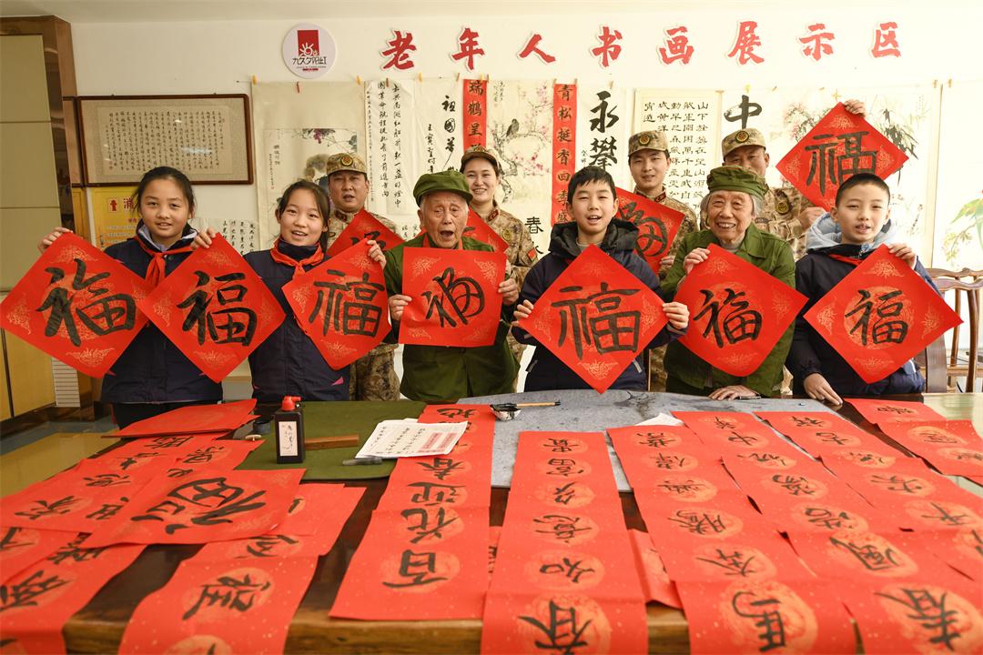 圖為小學(xué)生和抗美援朝老兵一起寫對(duì)聯(lián)。