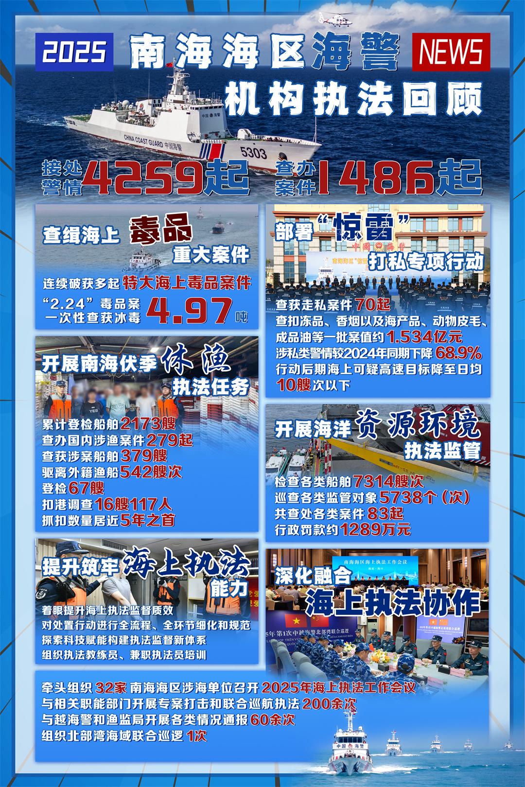 2025年,該局先后牽頭組織廣東、廣西、海南三省(區(qū))各級海警機構,開展“驚雷”“凈?!薄氨毯!薄矮B獵”、伏季休漁等各項綜合執(zhí)法任務,累計接處警情4259起,同比下降19.5%,查辦各類案件1486起,同比上升0.9%,以實際行動書寫新時代南海海區(qū)執(zhí)法工作嶄新答卷。