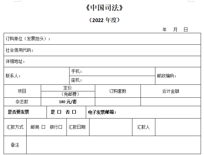 單位匯款時(shí)請務(wù)必標(biāo)明“中國司法+訂購套數(shù)”,個(gè)人匯款請務(wù)必注明“單位名稱+中國司法”。