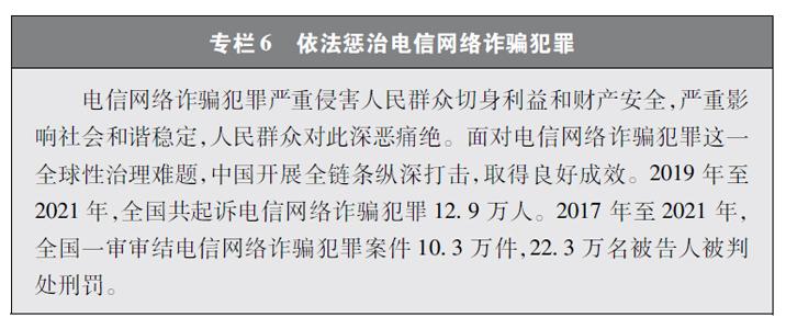 加大網(wǎng)絡(luò)犯罪懲治力度。隨著互聯(lián)網(wǎng)技術(shù)的快速發(fā)展,傳統(tǒng)犯罪加速向以互聯(lián)網(wǎng)為媒介的非接觸式犯罪轉(zhuǎn)變,電信網(wǎng)絡(luò)詐騙、網(wǎng)絡(luò)賭博、網(wǎng)絡(luò)淫穢色情等涉網(wǎng)違法犯罪多發(fā)。中國依法辦理新型網(wǎng)絡(luò)犯罪案件。連續(xù)多年開展“凈網(wǎng)行動”,嚴厲打擊群眾反映強烈的黑客攻擊破壞、侵犯公民個人信息等違法犯罪活動。持續(xù)推進“云劍”“斷卡”“斷流”“拔釘”等專項行動,打擊套路貸、校園貸、“以房養(yǎng)老”、“投資養(yǎng)老”等電信網(wǎng)絡(luò)詐騙犯罪,依法懲處為電信網(wǎng)絡(luò)詐騙犯罪團伙提供互聯(lián)網(wǎng)接入、域名注冊、服務(wù)器托管、移動互聯(lián)網(wǎng)應(yīng)用程序制作開發(fā)、網(wǎng)絡(luò)支付、引流推廣等服務(wù)支撐的黑灰產(chǎn)業(yè)。完善國家反詐大數(shù)據(jù)平臺和反詐移動互聯(lián)網(wǎng)應(yīng)用程序,建設(shè)國家涉詐黑樣本庫,完善快速止付凍結(jié)機制、涉詐資金返還機制。堅決打擊網(wǎng)絡(luò)賭博犯罪行為,從嚴治理網(wǎng)絡(luò)淫穢色情。網(wǎng)絡(luò)犯罪治理工作取得明顯成效,人民群眾安全感有效提升,社會更加和諧穩(wěn)定。