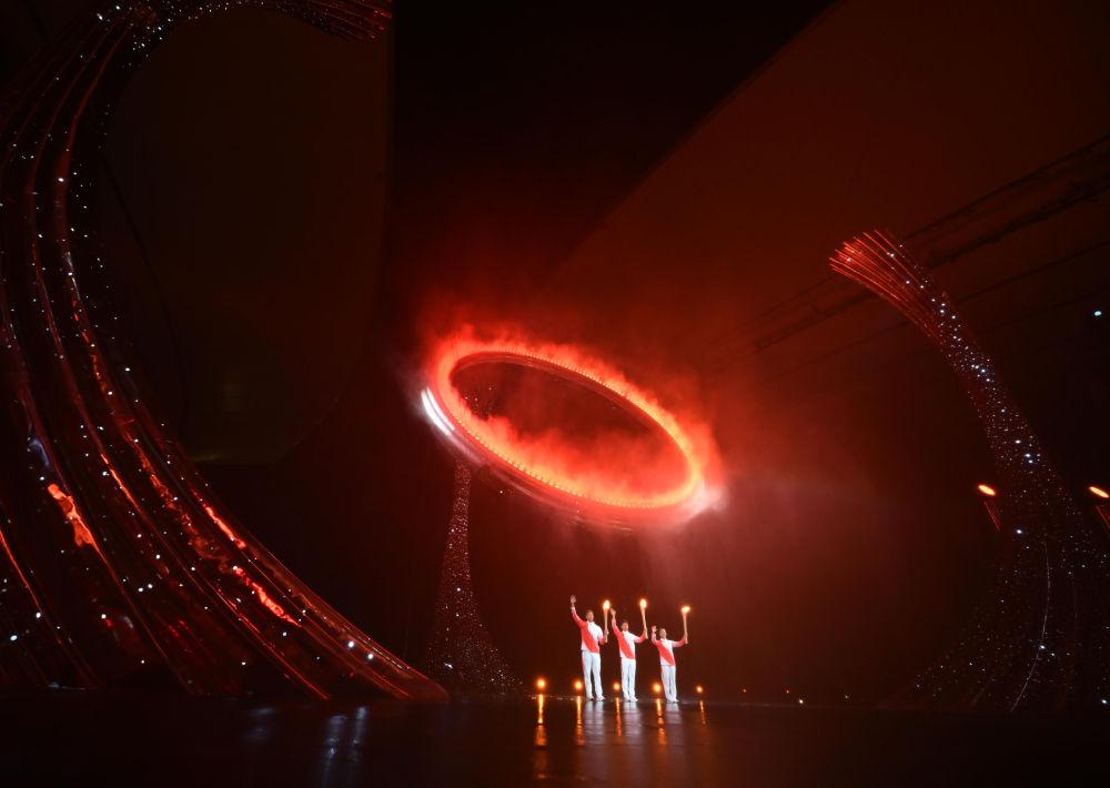 2025年11月9日,第十五屆全國(guó)運(yùn)動(dòng)會(huì)開(kāi)幕式在廣東奧林匹克體育中心舉行。這是火炬手蘇炳添(中)、張家朗(左)、李祎點(diǎn)燃主火炬后向觀眾致意。新華社記者 肖藝九 攝