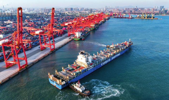 在山東港口日照港集裝箱碼頭,滿載集裝箱的船舶駛離港口(2025年12月5日攝) 新華社發(fā)(李大偉攝)