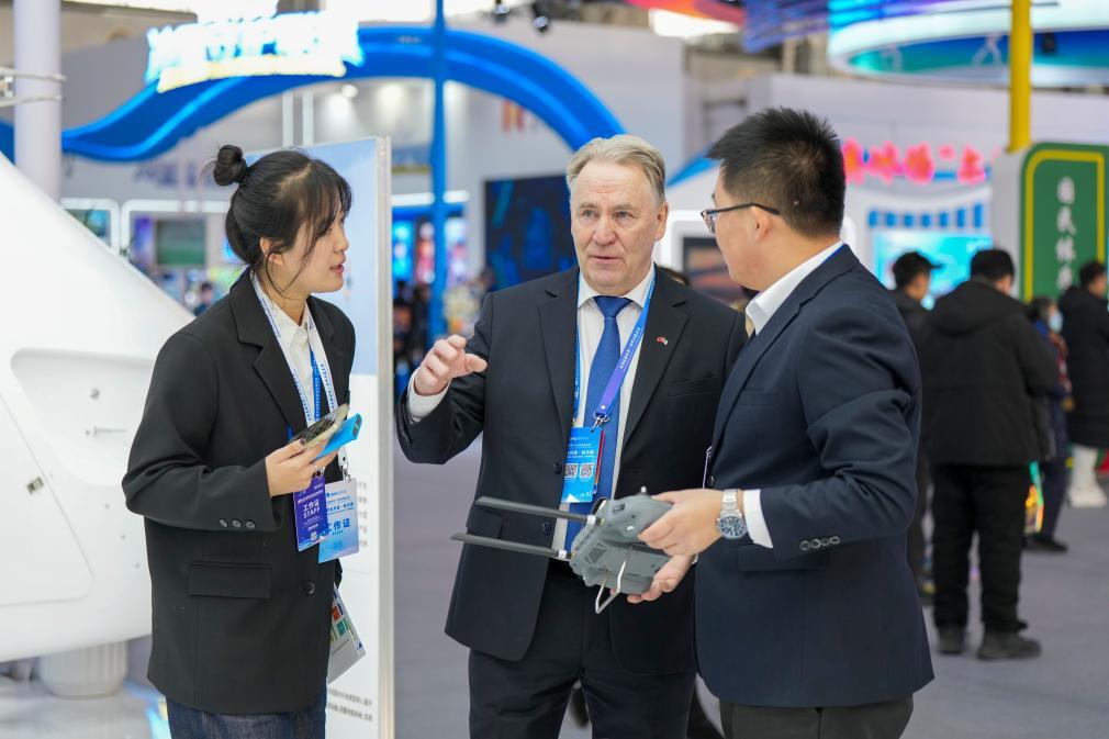 1月6日,在2026哈爾濱國際冰雪經濟博覽會現場,參會嘉賓(中)在了解一款工業(yè)無人機的參數和性能。新華社記者 王松 攝