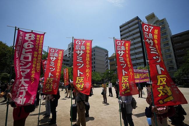 5月21日,民眾聚集在日本廣島袋町公園,抗議七國集團(tuán)峰會。新華社記者 張笑宇 攝