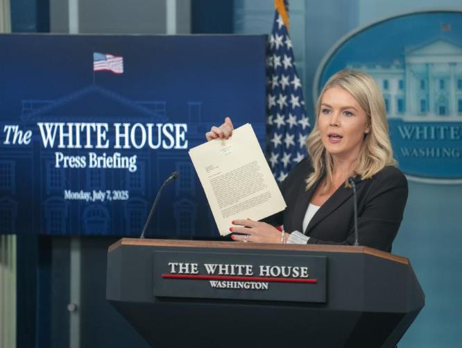 7月7日,在美國首都華盛頓白宮,白宮新聞發(fā)言人卡羅琳·萊維特在記者會(huì)上展示美國總統(tǒng)特朗普致日本首相的信函。新華社記者胡友松攝