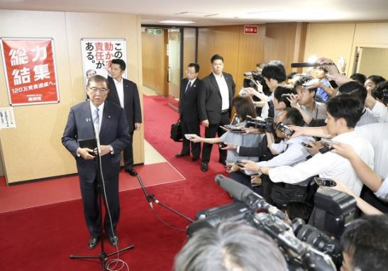 圖為當(dāng)?shù)貢r間7月23日,日本東京,日本首相石破茂在自民黨總部與三位前首相會晤后回答記者提問。 CFP供圖