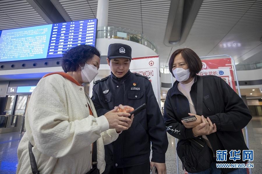 重慶西站候車廳,鐵路民警向旅客講解如何識別非法網(wǎng)站。新華網(wǎng)發(fā)(胡勇 攝)