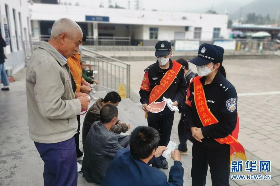 黔江站站前廣場,鐵路民警向旅客宣傳國家安全知識和防范電信網(wǎng)絡詐騙常識。新華網(wǎng)發(fā)(徐玲玲 攝)
