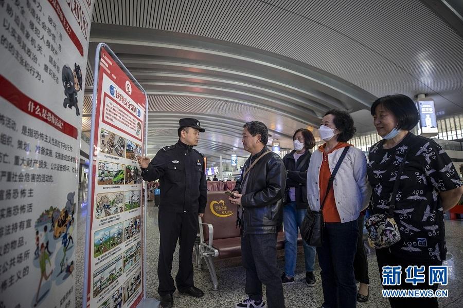 在重慶北站、重慶西站、萬州北站等鐵路樞紐車站,重慶鐵路警方聯(lián)合屬地公安機關、車站管委會、鐵路企業(yè)等單位,組織民警、職工在站前廣場、候車大廳等旅客較多的地方,宣講鐵路安全常識、電信詐騙、反邪教等知識,引導廣大旅客增強國家安全意識。