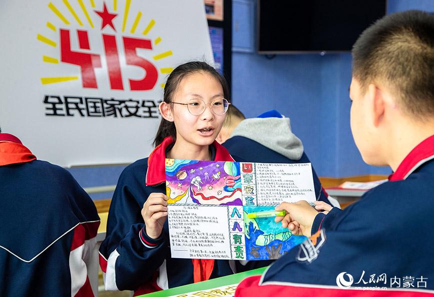 4月12日,內(nèi)蒙古呼和浩特市第二十六中學學生在展示繪制的國家安全教育主題手抄報。丁根厚 攝
