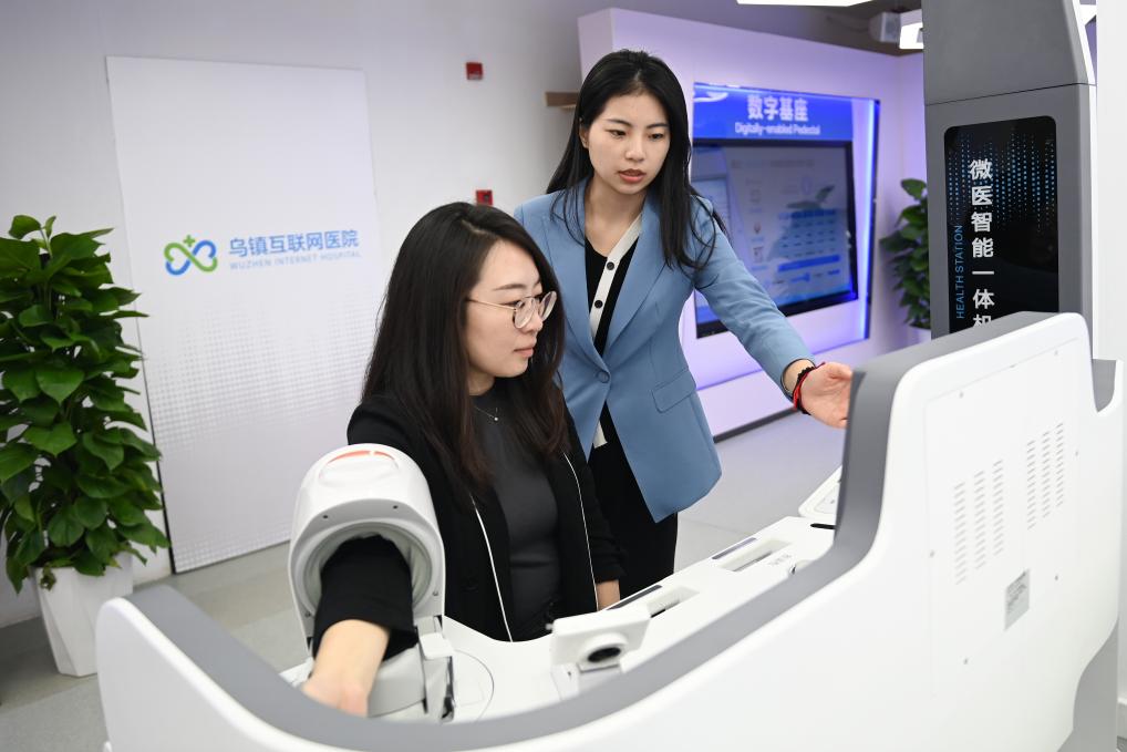11月7日,參觀者在烏鎮(zhèn)互聯(lián)網(wǎng)醫(yī)院體驗(yàn)智能一體機(jī)的體檢功能,并與醫(yī)生進(jìn)行視頻連線。 新華社記者黃宗治 攝