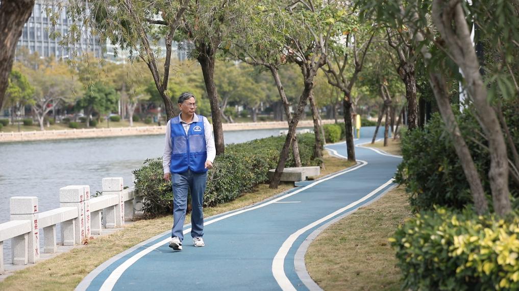 上午八點(diǎn)半,陳亞進(jìn)走出家門,乘公交車前往白鷺洲公園東公園巡湖。從東公園走到西公園,抵達(dá)位于西公園的筼筜湖保護(hù)中心,是他每次巡湖的基本路線?!坝袝r(shí)起得早我就早點(diǎn)來,有時(shí)候白天忙就晚上再來。西公園晚上很熱鬧,散步、健身、唱歌、跳舞樣樣都有?!标悂嗊M(jìn)說。
