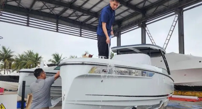 工作人員在清洗抵達游艇碼頭的參展游艇。記者 汪承賢 攝