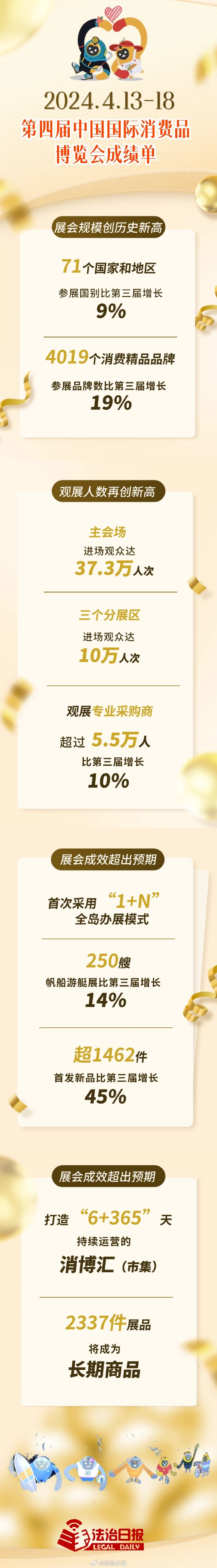 為期6天的第四屆中國國際消費(fèi)品博覽會(huì)于4月18日順利閉幕。6天48萬人,超1400件新品首發(fā)……閉幕會(huì)當(dāng)天下午,消博會(huì)曬出了亮麗的成績單,一起查收吧。(法治日?qǐng)?bào)全媒體記者 朱雨晨 趙暖芷)