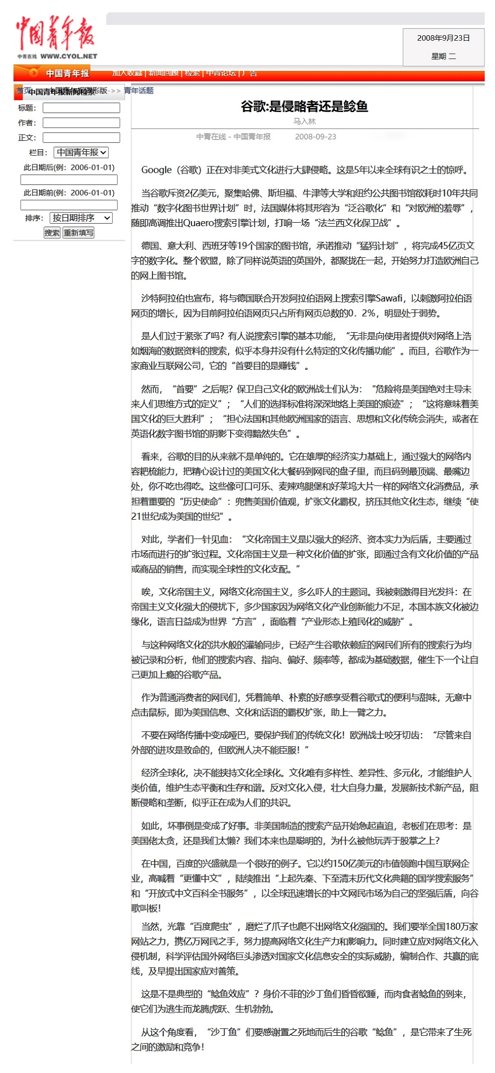 2008年9月23日,《中國(guó)青年報(bào)》“青年話題”專欄刊發(fā)《谷歌:是侵略者還是鯰魚》。