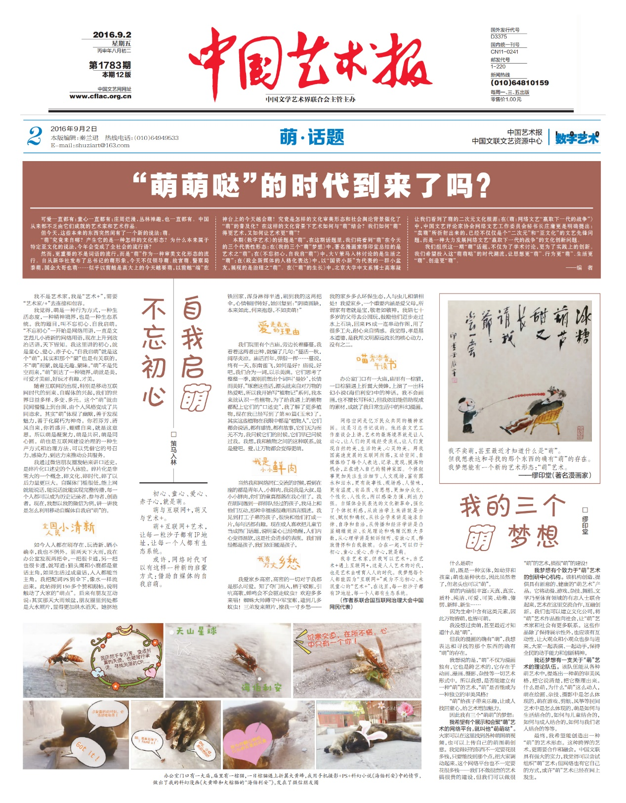 2016年8月6日,參加中國(guó)文聯(lián)文藝資源中心主題為“藝術(shù)的賣萌”的第二期藝術(shù)沙龍,發(fā)言并撰文《不忘初心 自我啟萌》,刊于9月2日《中國(guó)藝術(shù)報(bào)》。文章提出:我覺(jué)得,“萌”是一種行為方式,一種生活態(tài)度,一種精神境界,也是一種生態(tài)系統(tǒng)。我這里講的初心,就是童心、愛(ài)心、赤子心?!白晕覇⒚取本褪沁@個(gè)“萌”,其實(shí)和那個(gè)“蒙”也是有關(guān)聯(lián)的,不“萌”而蒙,就是無(wú)趣、蒙昧?!懊取辈皇菓{空而來(lái),“萌”到達(dá)了一種境界,萌就是美,可愛(ài)才美麗,好玩才有趣、才美。隨著互聯(lián)網(wǎng)的出現(xiàn),特別是移動(dòng)互聯(lián)網(wǎng)時(shí)代的到來(lái)、自媒體的興起,我們的世界日益多樣、多變、多元。這個(gè)“萌”就由民間慢慢上到臺(tái)面,由個(gè)人風(fēng)格變成了共同追求。其實(shí)“萌”體現(xiàn)了幽默,善于發(fā)現(xiàn)魅力,善于化腐朽為神奇。你若芬芳、清風(fēng)自來(lái),你若盛開(kāi)、蝴蝶自來(lái)。所以萌是凝聚力,萌是共識(shí),萌是同心圓。萌也是互聯(lián)網(wǎng)建設(shè)治理的一種生產(chǎn)方式和治理方法,可以憑借它的號(hào)召力、感染力、到達(dá)力來(lái)推動(dòng)公共服務(wù)。總書記在文藝工作座談會(huì)上指出,藝術(shù)的最高境界就是讓人動(dòng)心,讓人們的靈魂經(jīng)受洗禮,讓人們發(fā)現(xiàn)自然的美、生活的美、心靈的美。拜我國(guó)高速發(fā)展的互聯(lián)網(wǎng)所賜,互動(dòng)空間、自媒體給了每個(gè)人表達(dá)、記錄、發(fā)現(xiàn)、提高的機(jī)會(huì),正在進(jìn)入自己的精神家園。個(gè)體敘事更加關(guān)注生活細(xì)節(jié)、人文現(xiàn)場(chǎng),富有露水和淚水,更有故事性、現(xiàn)場(chǎng)感、人情味, 更有溫度、有品質(zhì)、有思想,更加分眾化、個(gè)性化、人性化,所以感染力強(qiáng)、到達(dá)力強(qiáng)。自媒體全民表達(dá)的文化新革命,強(qiáng)化了個(gè)體權(quán)利感,就是分權(quán)、賦權(quán)和確權(quán),就是追求自律、自凈和自洽,就是凸顯蝴蝶效應(yīng)、長(zhǎng)尾理論和喚醒沉默大多數(shù),就是傾訴傾聽(tīng)、安放心靈、釋放情懷和自我救贖。合在一起,可以歸于初心、童心、愛(ài)心、赤子心,就是萌。我非藝術(shù)家,但我可以“藝術(shù)+”,當(dāng)“藝術(shù)+”遇上“互聯(lián)網(wǎng)+”,這便是人人藝術(shù)的時(shí)代,也是藝術(shù)去哺育人人的時(shí)代。我夢(mèng)想每個(gè)人都能因?yàn)椤盎ヂ?lián)網(wǎng)+”成為不忘初心、未泯童心的“藝術(shù)+”,在這里,每一粒沙子都有IP地址,每一個(gè)人都有生態(tài)系統(tǒng)。