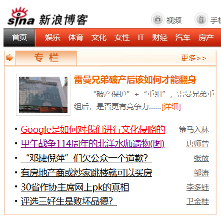 2008年9月18日,新浪博客首頁(yè)推薦《Google是如何對(duì)我們進(jìn)行文化侵略的》,標(biāo)題為編輯所改。