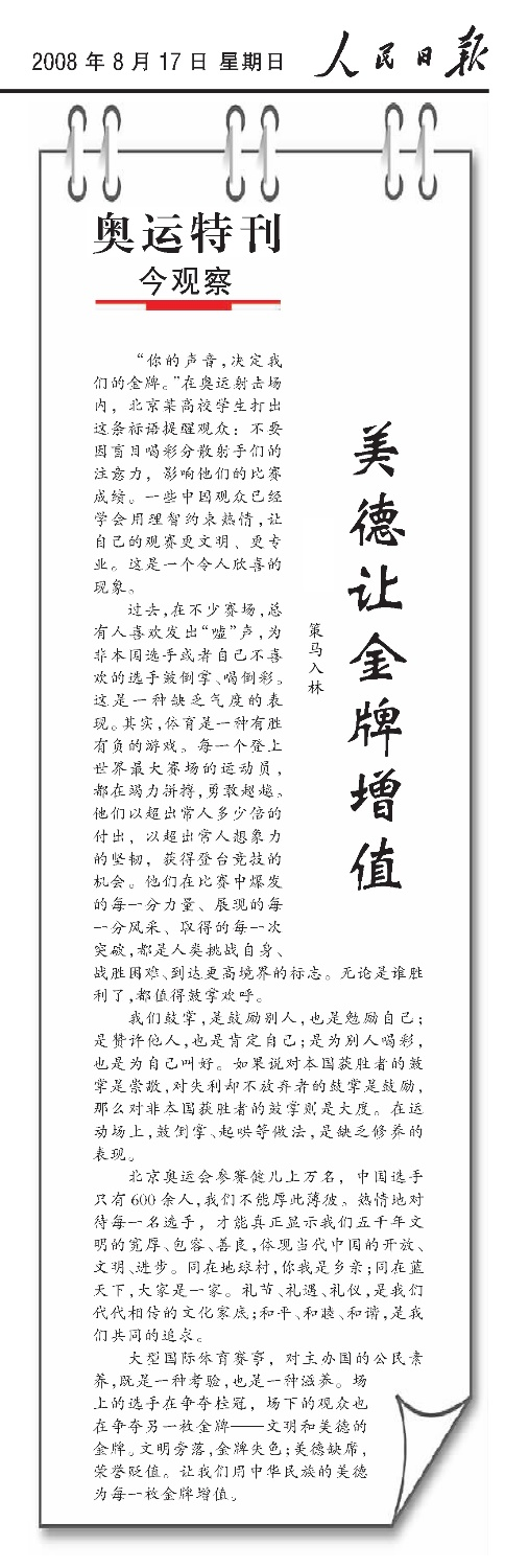 2008年8月17日,《人民日?qǐng)?bào)》刊發(fā)博文《美德讓金牌增值》。