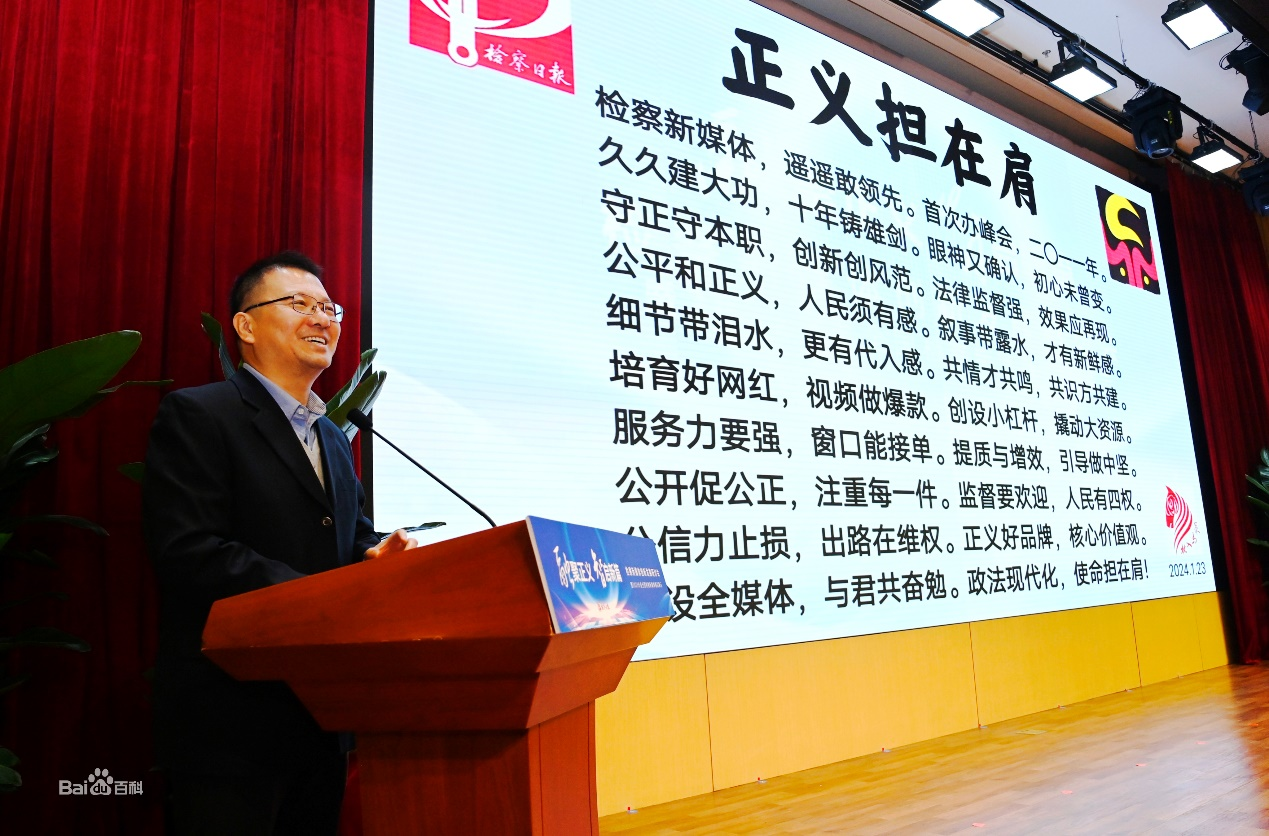 2024年1月23日,參加檢察新媒體創(chuàng)新發(fā)展研討會暨2023年度全國檢察新媒體精品展示活動,發(fā)言提出:我從2013年至今參加過6屆檢察日報社新媒體活動,是資深粉絲,有深厚感情。檢察日報社團(tuán)結(jié)檢察機(jī)關(guān)新媒體同仁秉承“強(qiáng)化法律監(jiān)督維護(hù)公平正義”宗旨,久久為功,十年鑄劍,成功打造了“正義”新媒體融媒體品牌,令人備感振奮、備受鼓舞。在新時代新征程上,希望“正義”新媒體融媒體守正創(chuàng)新,注重共情共鳴,集結(jié)社會力量,通過短視頻等新傳播方式,充分呈現(xiàn)法律監(jiān)督效果,講好政法故事,增強(qiáng)傳播力服務(wù)力監(jiān)督力公信力,讓人民群眾在每一個司法案件中感受到公平正義。《正義擔(dān)在肩》:檢察新媒體,遙遙敢領(lǐng)先。首次辦峰會,二〇一一年。久久建大功,十年鑄利劍。眼神又確認(rèn),初心未曾變。守正守本職,創(chuàng)新創(chuàng)風(fēng)范。法律監(jiān)督強(qiáng),效果應(yīng)再現(xiàn)。公平和正義,人民須有感。敘事帶露水,才有新鮮感。細(xì)節(jié)帶淚水,更有代入感。共情才共鳴,共識方共建。培育好網(wǎng)紅,視頻做爆款。創(chuàng)設(shè)小杠桿,撬動大資源。服務(wù)力要強(qiáng),窗口能接單。提質(zhì)與增效,引導(dǎo)做中堅。公開促公正,注重每一件。監(jiān)督要?dú)g迎,人民有四權(quán)。公信力止損,出路在維權(quán)。正義好品牌,核心價值觀。建設(shè)全媒體,與君共奮勉。政法現(xiàn)代化,使命擔(dān)在肩。