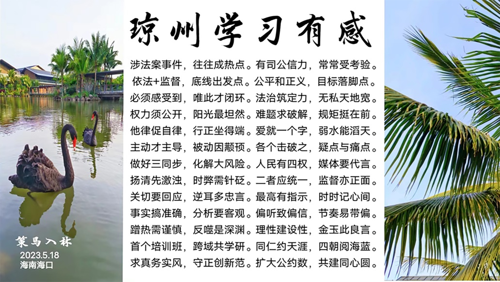 2020年9月22日,參加中央網(wǎng)信辦、中央政法委指導(dǎo)的“大國小鮮 基層之治”網(wǎng)絡(luò)主題宣傳活動(dòng),發(fā)言提出:社會(huì)治理就是“烹小鮮”,這個(gè)看起來很大的題目,核心還是人,每一個(gè)人的合理需求和合法權(quán)益都是社會(huì)治理服務(wù)的對象。依法維護(hù)廣大人民群眾和一家一戶一人的合法權(quán)益,才能真正維護(hù)和諧安定的社會(huì)秩序。守護(hù)好萬家燈火就是我們工作和服務(wù)的內(nèi)涵,用繡花針工夫做好社會(huì)治理大文章。媒體通過作品的傳播力、影響力、公信力,真實(shí)還原治理一線“烹小鮮”行為,生動(dòng)呈現(xiàn)基層守正創(chuàng)新、擔(dān)當(dāng)作為的故事細(xì)節(jié),同時(shí)以共情力和同情心洞察百姓期待與訴求。