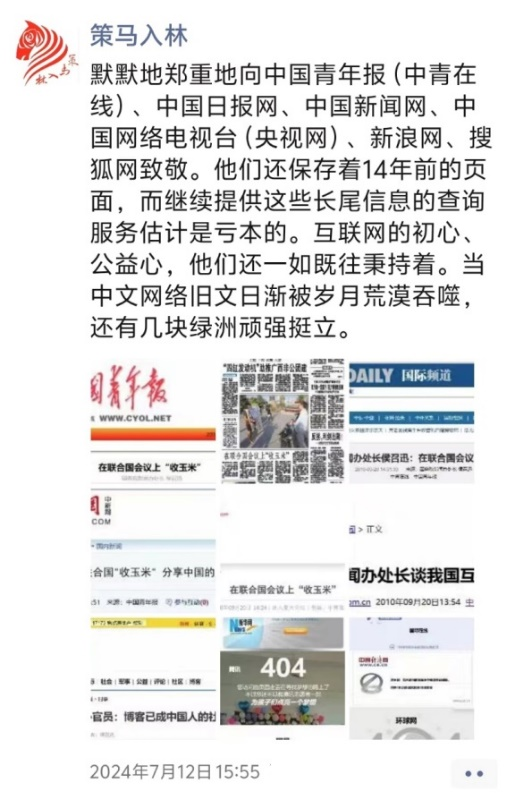 2024年7月3日,我發(fā)了一條朋友圈:前些天看到有人說網(wǎng)絡(luò)“崩塌”,有點(diǎn)著慌,馬上去找以前寫的一些帖文,真發(fā)現(xiàn)了問題。多年前可以搜到數(shù)千上萬條自己寫的稿子或與己有關(guān)的信息,現(xiàn)在去重、有用的所剩不多,還被一些收費(fèi)網(wǎng)站囤去一些,不交錢不讓看。QQ空間日志(騰訊博客)的一千多篇還在,互動(dòng)也在,鏈接卻多成死鏈。新浪博客的一千多篇也在,互動(dòng)沒了,考慮到博主需要,設(shè)置了備份按鈕,確實(shí)負(fù)責(zé)任。早已停服的博客中國,竟然還能打開。鏈接的新聞網(wǎng)頁還在的,有新浪網(wǎng)、中國青年報(bào)中青在線、中國日報(bào)網(wǎng)、中國新聞網(wǎng)、央視網(wǎng)、搜狐網(wǎng)等。包括人民網(wǎng)、新華網(wǎng)、中國網(wǎng)、國際在線、央廣網(wǎng)等大多數(shù)新聞網(wǎng)站及騰訊新聞、網(wǎng)易新聞、鳳凰新聞等,已經(jīng)404或403,而我最多的鏈接是人民網(wǎng)的,真是遺憾。對低效益的冷寂長尾內(nèi)容,很多網(wǎng)站平臺(tái)不愿再運(yùn)營維護(hù),便卸載斷服?!盎ヂ?lián)網(wǎng)是有記憶的”,這話需要加以限定了,十年記憶就不容易,“永久”“免費(fèi)”已是傳說。接下來,有用的盡快備份吧,不管微博微信短視頻啥的,來有影去無蹤,或終將煙消云散南柯夢。值得敬佩的是一些良心平臺(tái),尚能以公益為重,秉持初心,堅(jiān)持至今,繼續(xù)提供信息服務(wù),不容易不簡單。