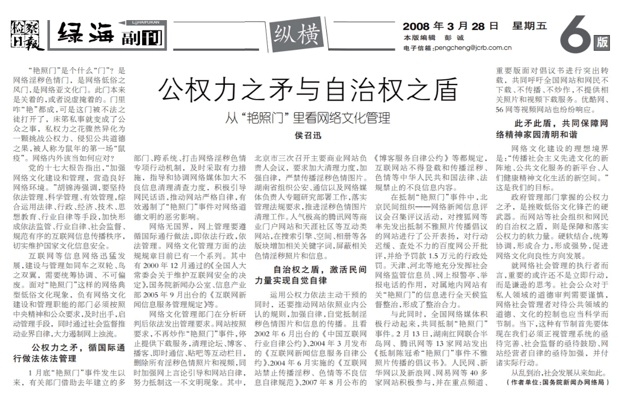 針對“艷照門”等網(wǎng)絡(luò)低俗文化現(xiàn)象的治理,撰寫《公權(quán)力之矛與自治權(quán)之盾——從“艷照門”里看網(wǎng)絡(luò)文化管理》,刊于2008年3月28日《檢察日報(bào)》。文章提出,負(fù)有網(wǎng)絡(luò)文化建設(shè)和管理職能的部門要遵循國際通行做法,依法行政,依法管理,及時(shí)出手,啟動(dòng)管理手段。運(yùn)用公權(quán)力依法主動(dòng)干預(yù)的同時(shí),還要推動(dòng)網(wǎng)站依照業(yè)內(nèi)公認(rèn)的規(guī)則,加強(qiáng)自律,自覺抵制淫穢色情圖片和信息的傳播。政府管理部門掌握的公權(quán)力之矛,是挫敗低俗文化鋒芒的硬武器。而網(wǎng)站等社會(huì)組織和網(wǎng)民的自治權(quán)之盾,則是保障和落實(shí)公權(quán)力的軟力量。硬軟結(jié)合,統(tǒng)籌協(xié)調(diào),形成合力,促進(jìn)網(wǎng)絡(luò)文化良性發(fā)展。就網(wǎng)絡(luò)社會(huì)管理的執(zhí)行者而言,非常重要的一點(diǎn)是謙遜的思考。社會(huì)公眾對于私人領(lǐng)域的道德審判需要謹(jǐn)慎,網(wǎng)絡(luò)社會(huì)管理者對待公共領(lǐng)域的管控也應(yīng)當(dāng)科學(xué)而節(jié)制。當(dāng)下,管理系統(tǒng)亟待完善,社會(huì)監(jiān)督亟待鼓勵(lì),網(wǎng)站經(jīng)營者自律亟待加強(qiáng)。