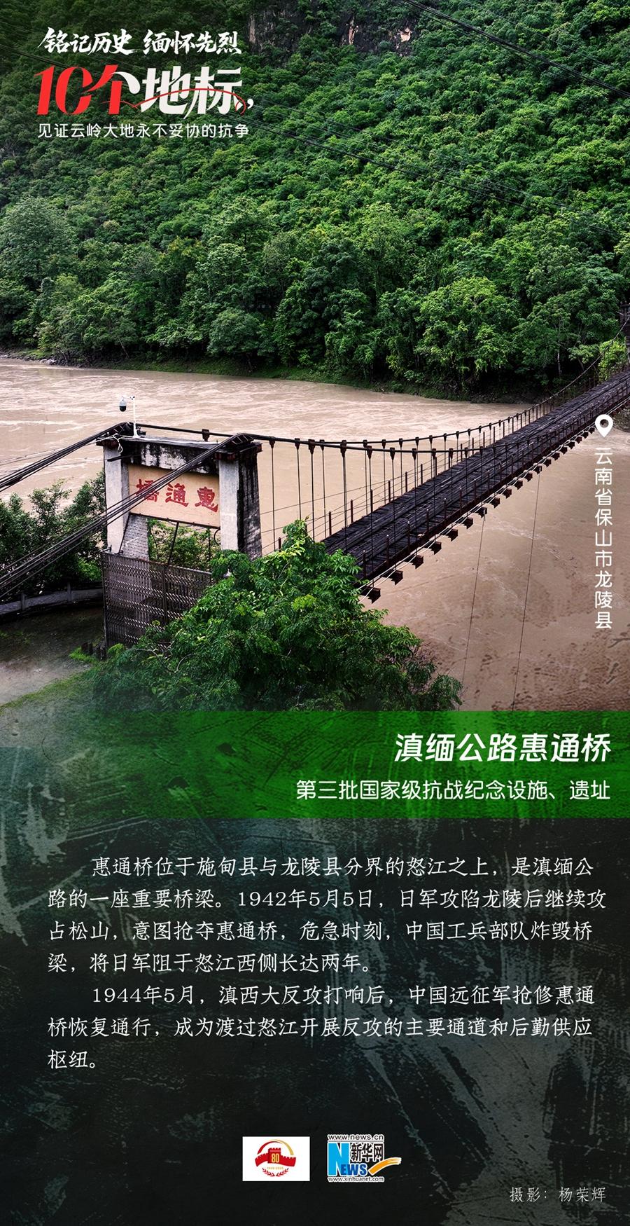 80年過去,曾經(jīng)的戰(zhàn)場硝煙雖散,但英氣永存。在國務(wù)院公布的前三批國家級(jí)抗戰(zhàn)紀(jì)念設(shè)施、遺址名錄中,云南省共有10個(gè),分別為騰沖國殤墓園、騰沖滇西抗戰(zhàn)紀(jì)念館,龍陵抗日戰(zhàn)爭紀(jì)念館,國立西南聯(lián)合大學(xué)舊址,抗戰(zhàn)勝利紀(jì)念堂,松山戰(zhàn)役舊址,南洋華僑機(jī)工回國抗日紀(jì)念碑,怒江駝峰航線紀(jì)念館,施甸縣抗日江防遺跡群,滇緬公路惠通橋,滇西抗日戰(zhàn)爭紀(jì)念碑。它們承載著國人共同的歷史記憶與民族情感,也為我們學(xué)習(xí)和傳承抗戰(zhàn)精神提供了現(xiàn)實(shí)條件。