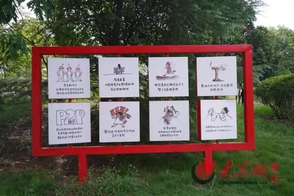 園區(qū)西南面休息區(qū)紅色支柱展示論述摘編九大主題目錄,北面紅色展板展示精選內(nèi)容,下方二維碼可在線瀏覽相關(guān)內(nèi)容。東南角學(xué)習(xí)驛站有互動(dòng)軟件和觸屏機(jī)器,科普電信網(wǎng)絡(luò)詐騙知識(shí)。