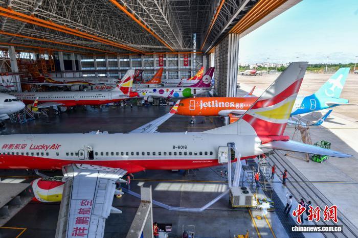 圖為多架進(jìn)境維修飛機(jī)正在海南自貿(mào)港一站式飛機(jī)維修產(chǎn)業(yè)基地內(nèi)進(jìn)行全面檢修。 中新網(wǎng)記者 駱云飛 攝