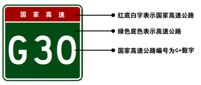 例如下圖所示是我國的最長的一條高速公路G30連霍高速(連云港至霍爾果斯高速公路)的標(biāo)識。其上方是紅底白字,標(biāo)識“國家高速”,連霍高速是一條東西橫線,下方編號為國道標(biāo)識符G和兩位偶數(shù)30。