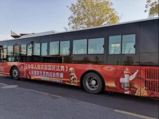 在宣傳《民法典》公交車(chē)車(chē)體內(nèi)外,精心營(yíng)造學(xué)習(xí)宣傳《民法典》的濃厚氛圍,將《民法典》公交專(zhuān)線主題設(shè)計(jì)為“《民法典》與生活同行”,車(chē)體以紅色為主基調(diào),圖文并茂,視覺(jué)沖擊力強(qiáng)。車(chē)內(nèi)兩側(cè)、坐椅靠背、車(chē)廂展板等位置進(jìn)行了全方位包裝,車(chē)內(nèi)移動(dòng)電視持續(xù)播放《民法典》宣傳短視頻,展示《民法典》中見(jiàn)義勇為免責(zé)、小區(qū)共有場(chǎng)地收入歸業(yè)主、夫妻共同債務(wù)如何界定等與百姓生活息息相關(guān)的法條。乘客在乘車(chē)的同時(shí),可以感受到學(xué)習(xí)《民法典》的樂(lè)趣和必要性。