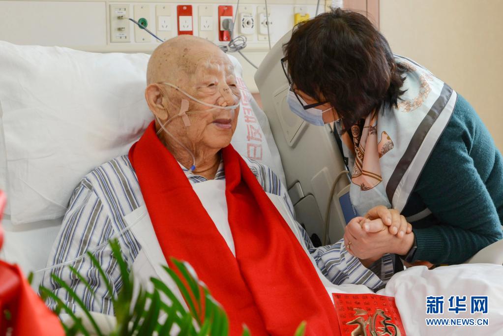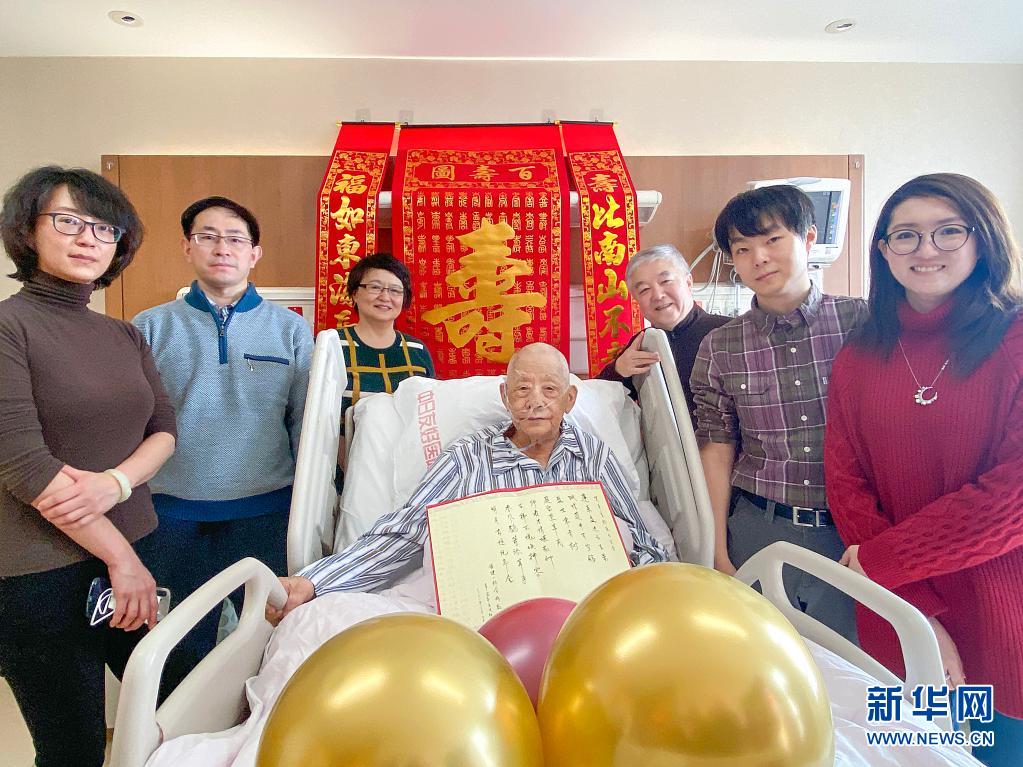 2021年2月12日,辛育齡在北京中日友好醫(yī)院慶祝百歲生日,與家人合影。新華社發(fā)(蔡瑩瑩 攝)