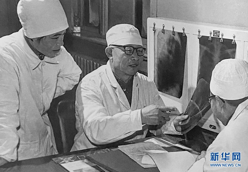 1980年1月16日,辛育齡(中)在內(nèi)蒙古結(jié)核病院與胸外科醫(yī)師討論病例(翻拍照片)。新華社記者 張玉薇 攝